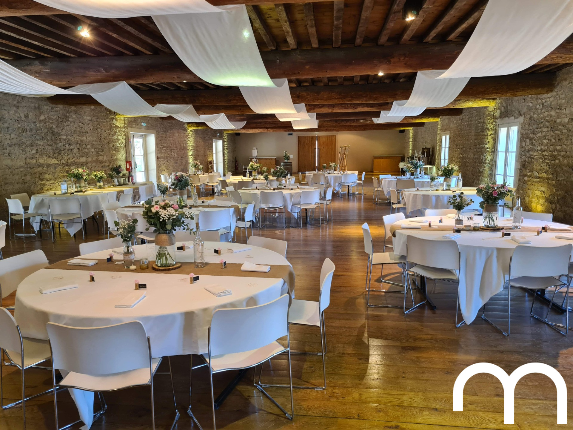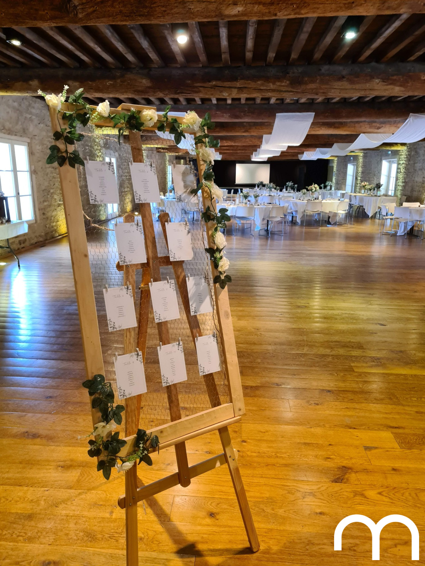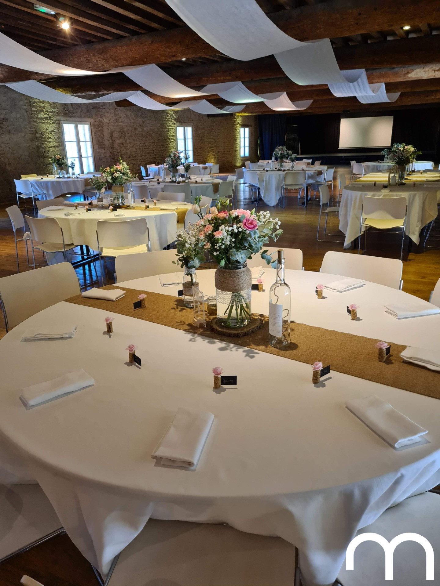 Décoration faite par les mariés, avec des marques places fait main et une décoration florale en centre de table également faite par les mariés.