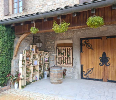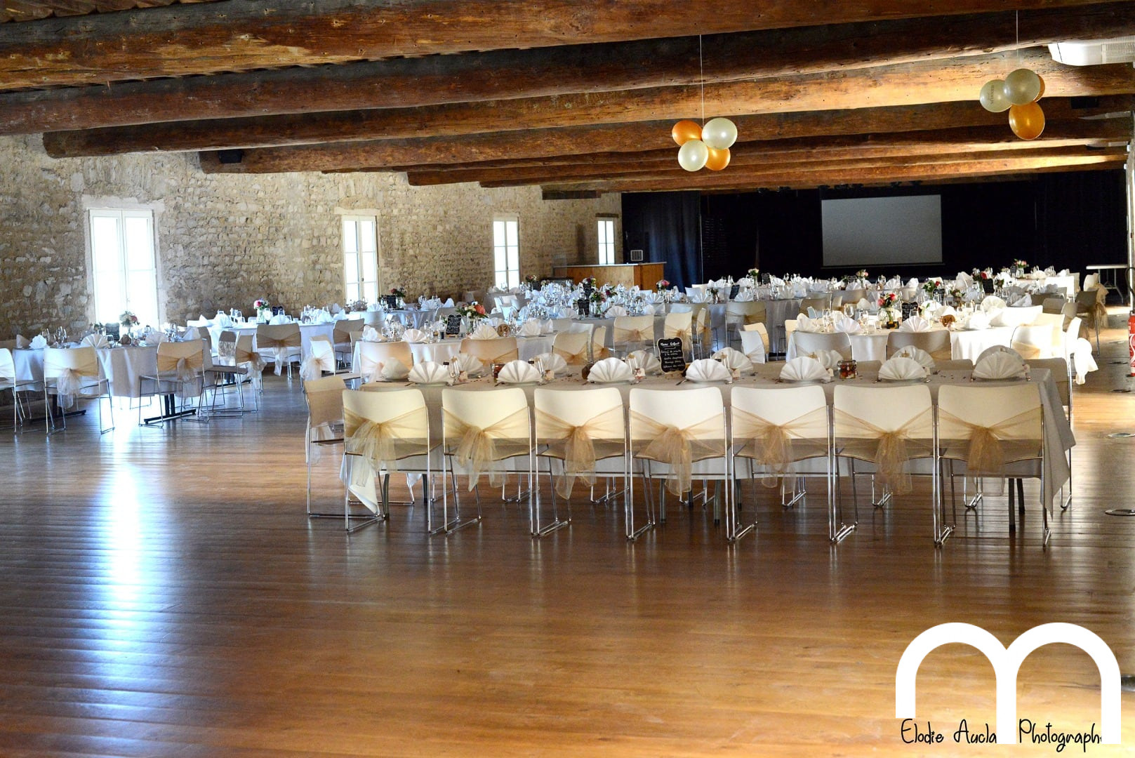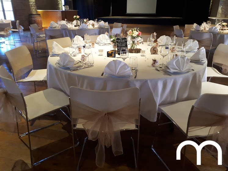 Mariage de J&E dans notre domaine du Beaujolais<br /><br />Cocktail dans la cour exterieure du caveau<br />Repas servi par la <a href="https://www.maison-combaz.fr/">Maison Combaz</a>, dans la salle de réception.<br />Noeuds chics sur l'ensemble des chaises. <br /><br />Photo par <a href="https://elodieauclairphotographie.book.fr/">Elodie Auclair</a>