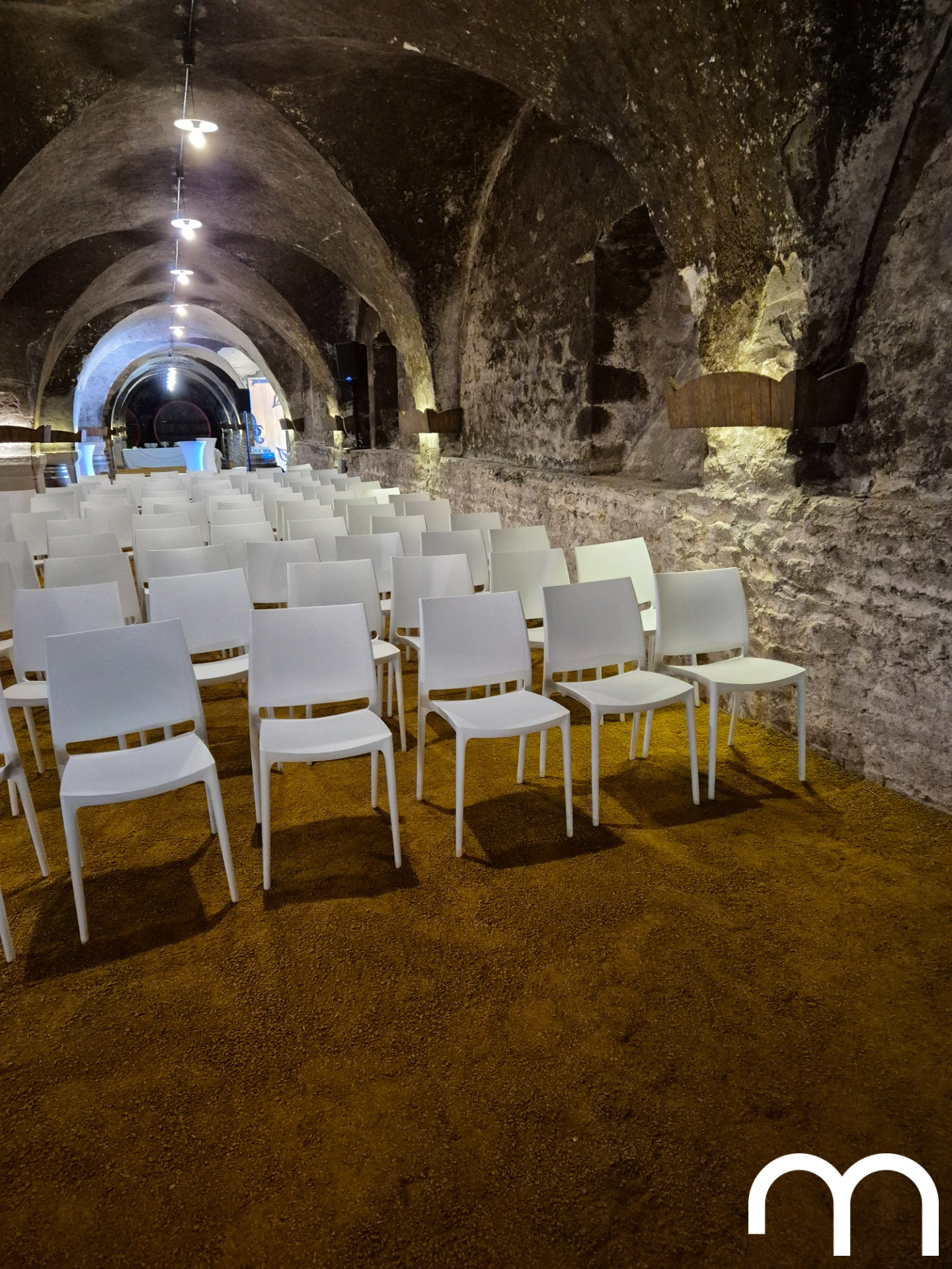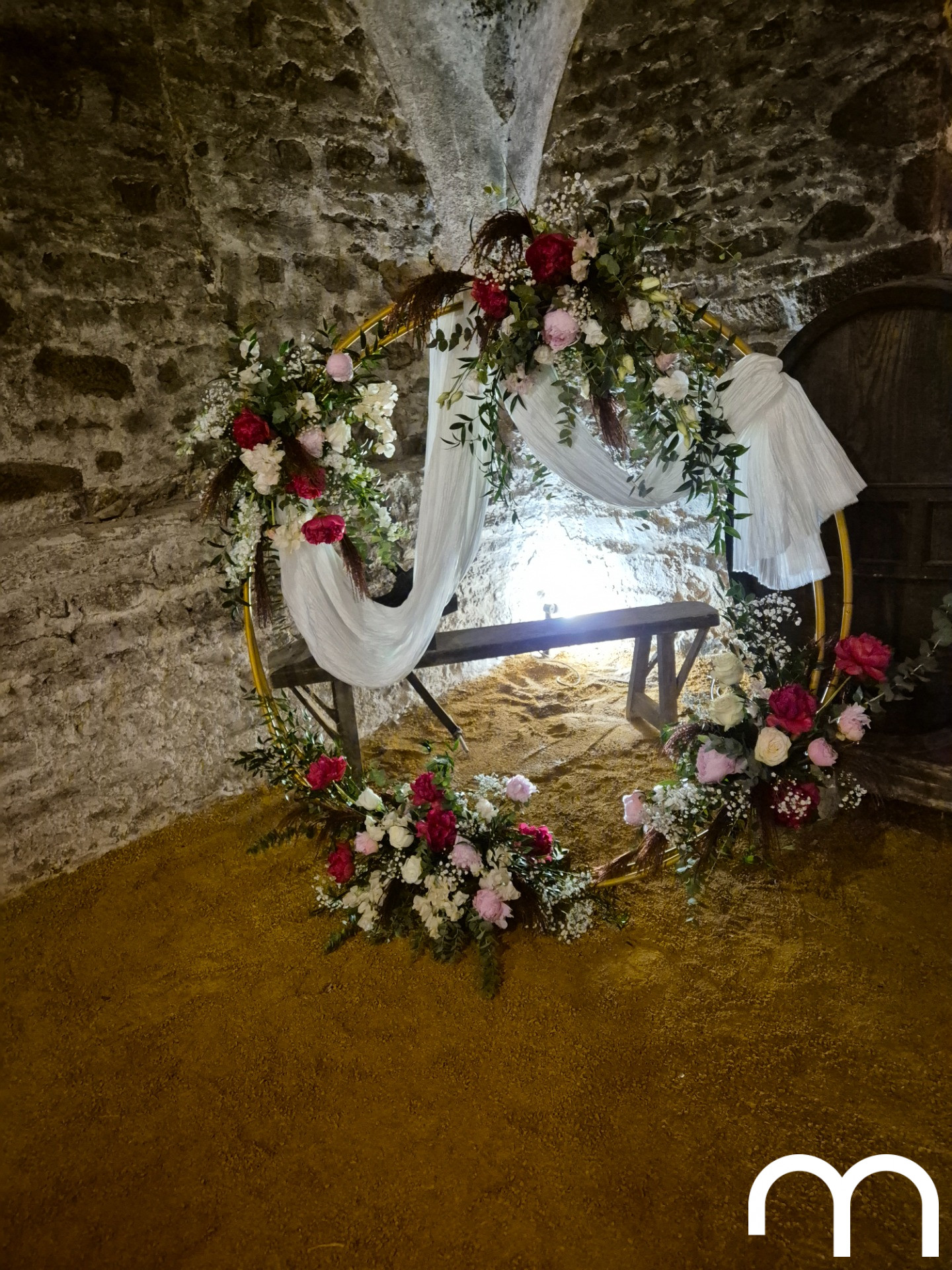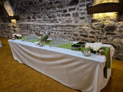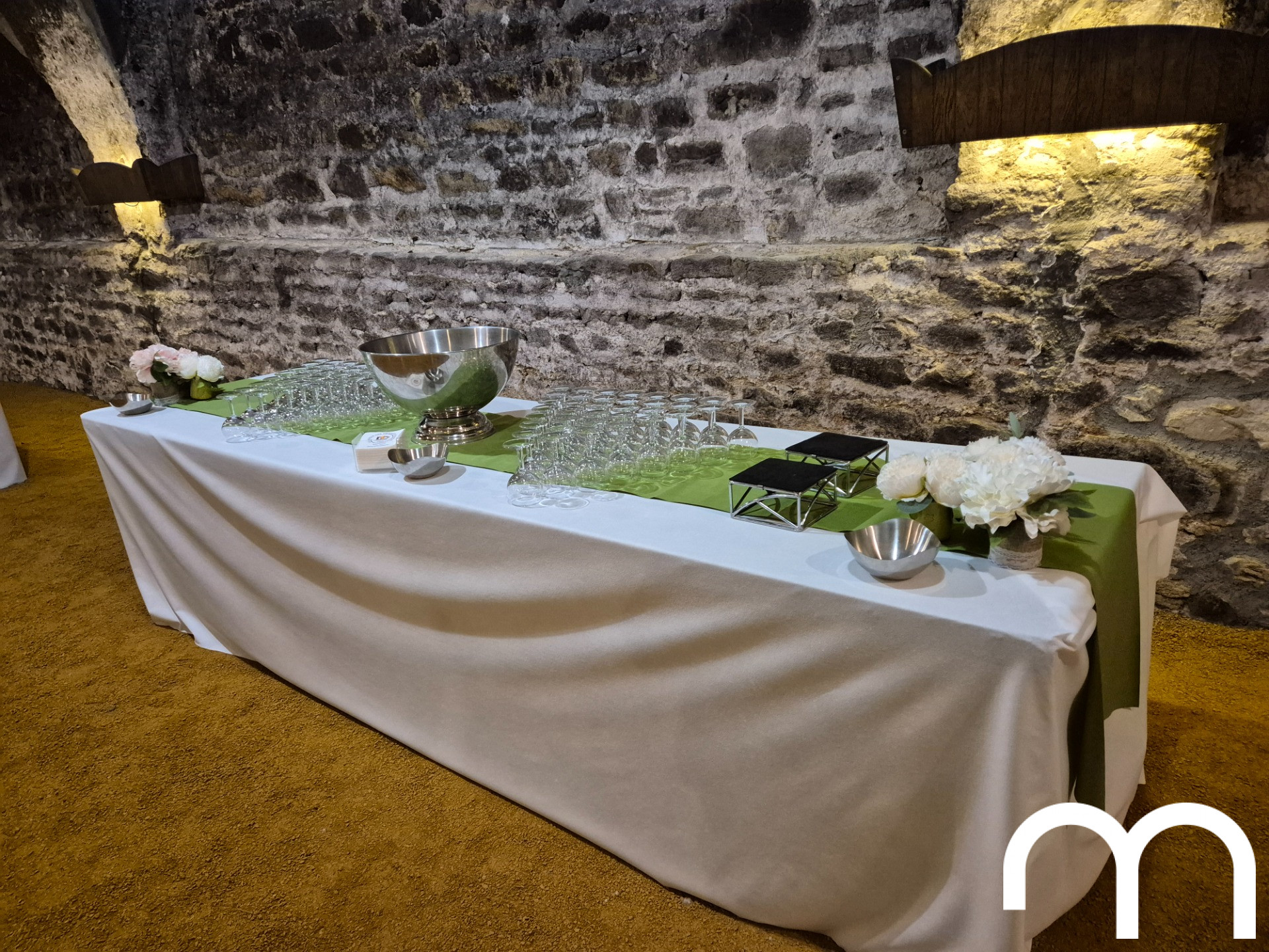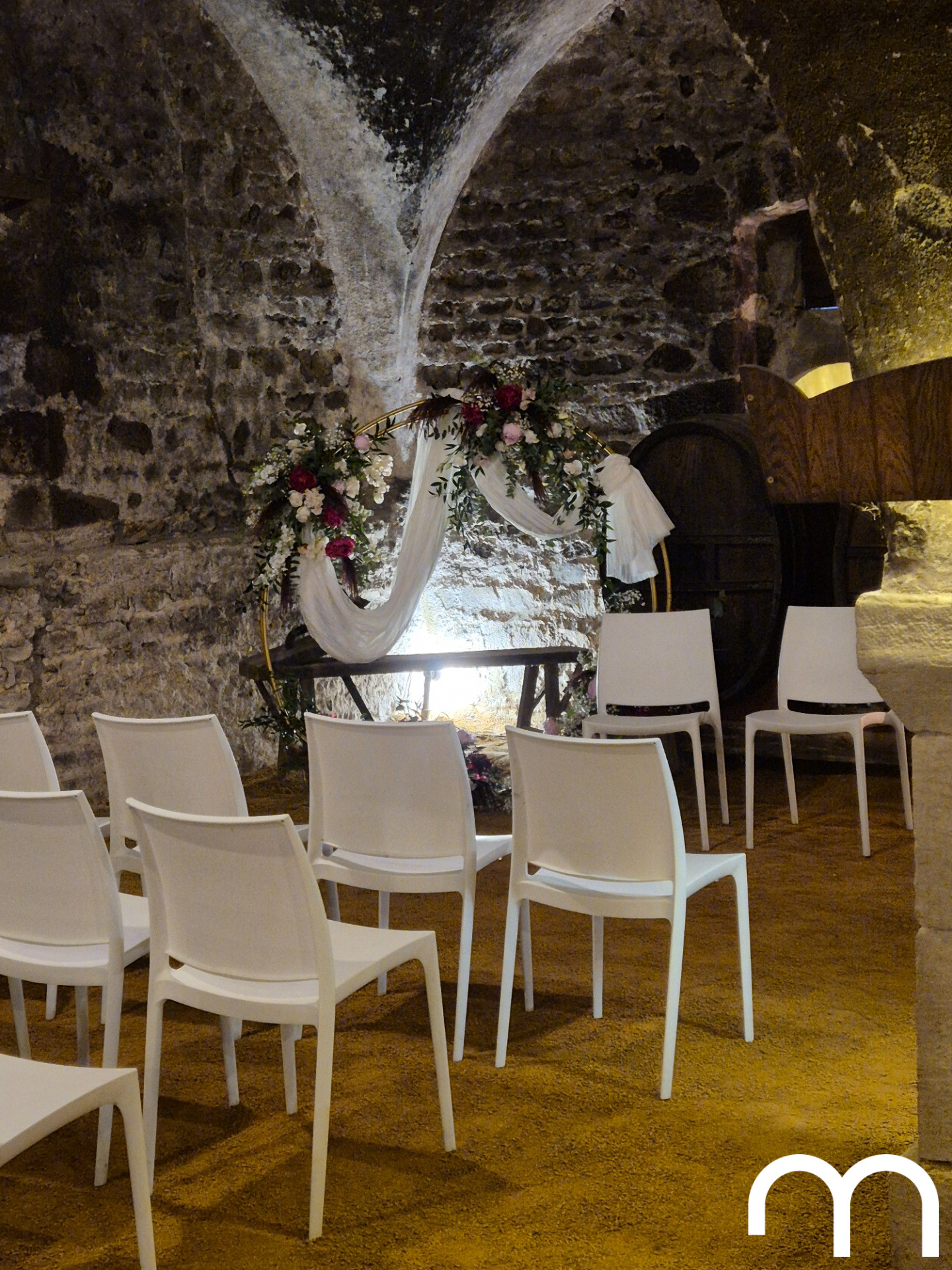Notre caveau traditionnel doté d'une double voute est bien plus qu'une solution de repli. C'est un lieu chargé d'histoire et d'authenticité qui sublime les cérémonies laïques. Avec ses voûtes en pierre, sa fraîcheur naturelle et son atmosphère unique, il offre une alternative de charme en cas de pluie ou de forte chaleur.